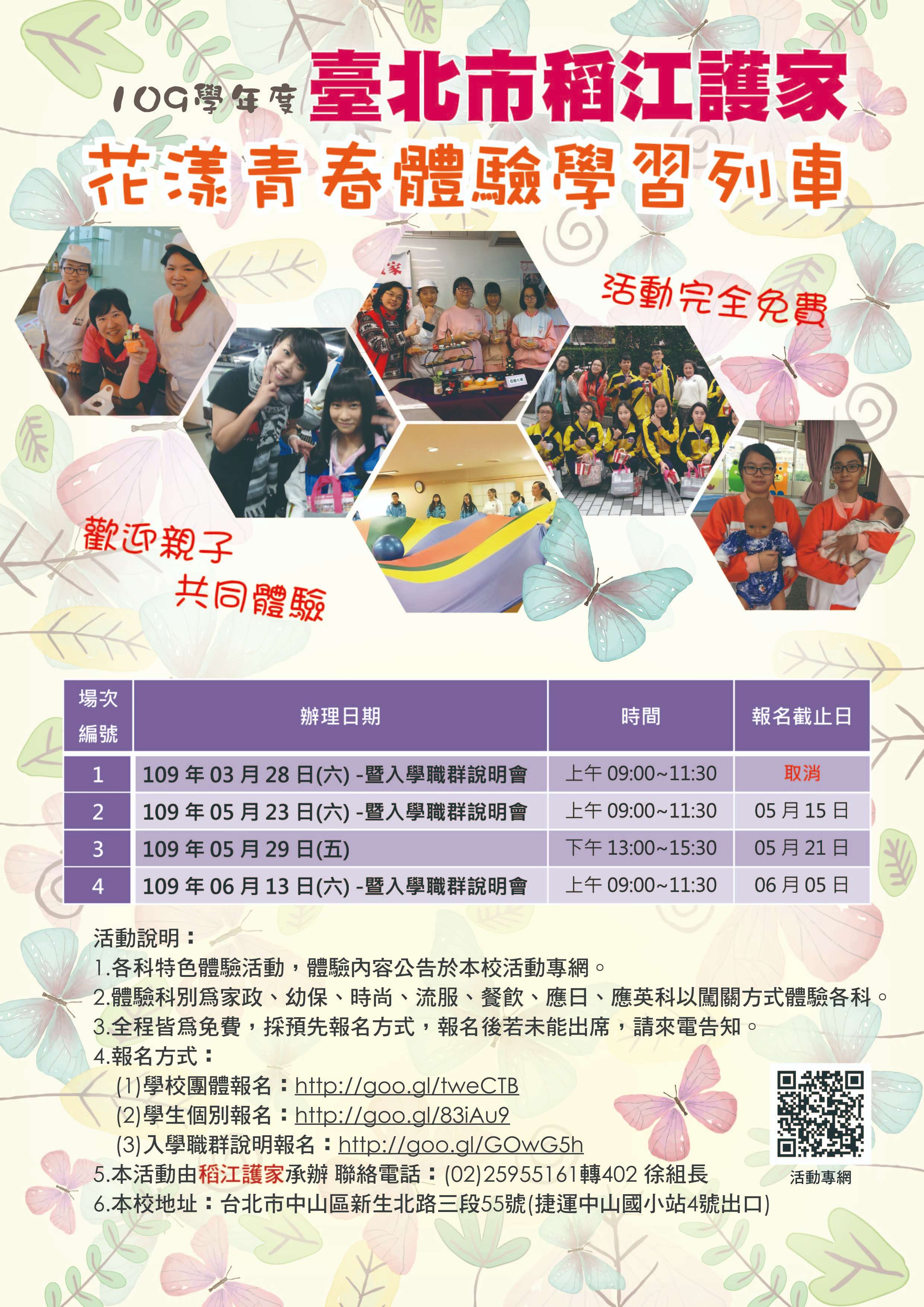 一、為協助學生及家長多元探索與體驗,本校於109年5月23日 (六)、109年5月29日(五)及109年6月13日(六)辦理 「群科體驗活動─花漾青春體驗學習列車」及「新生家長說明會」,認識與感受本校技職教育創新能量,以啟發學 生多元智能及性向,協助學生尋覓自我最適進路。