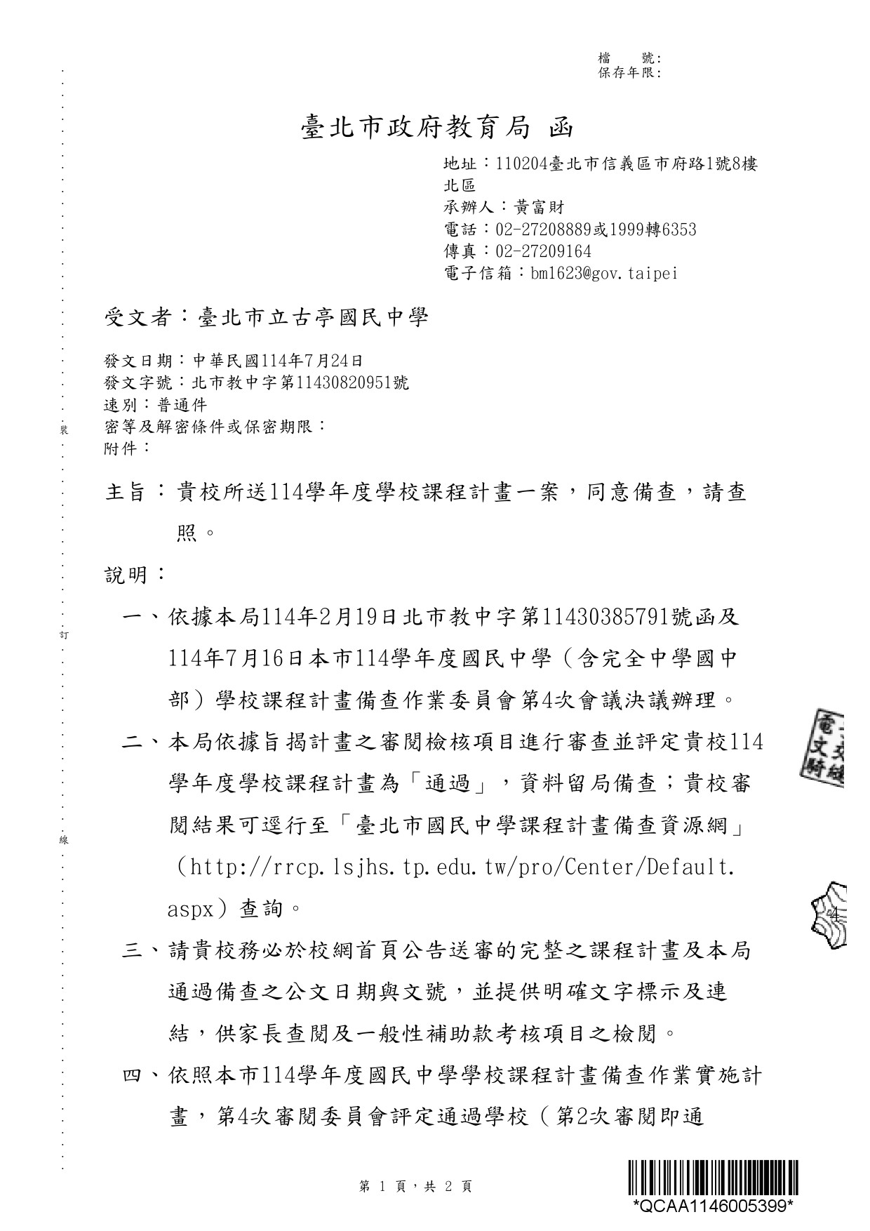 本校114學年度課程計畫審閱通過,公文檢陳如下: